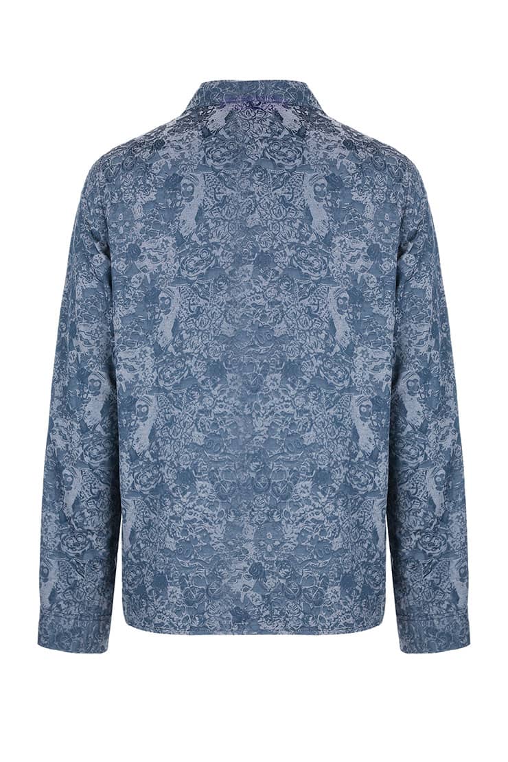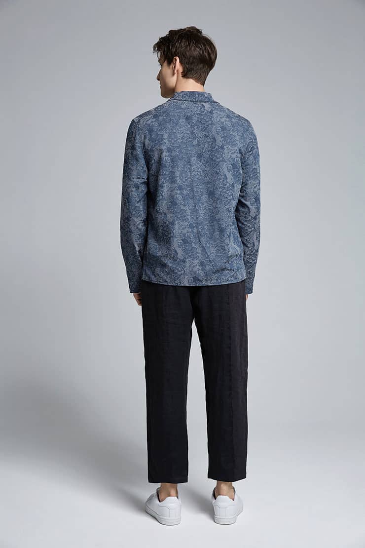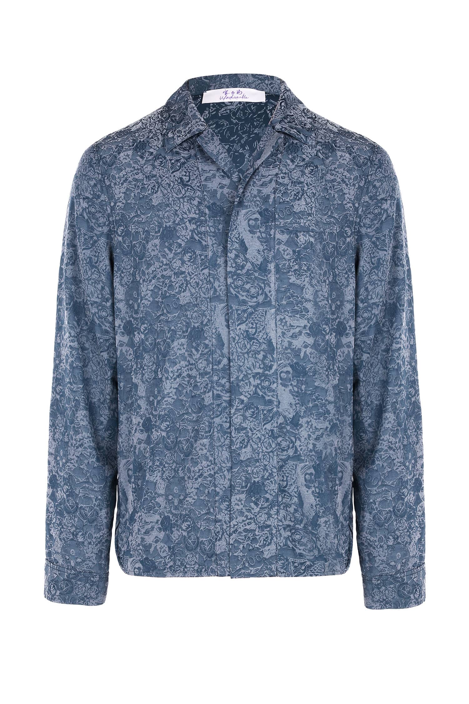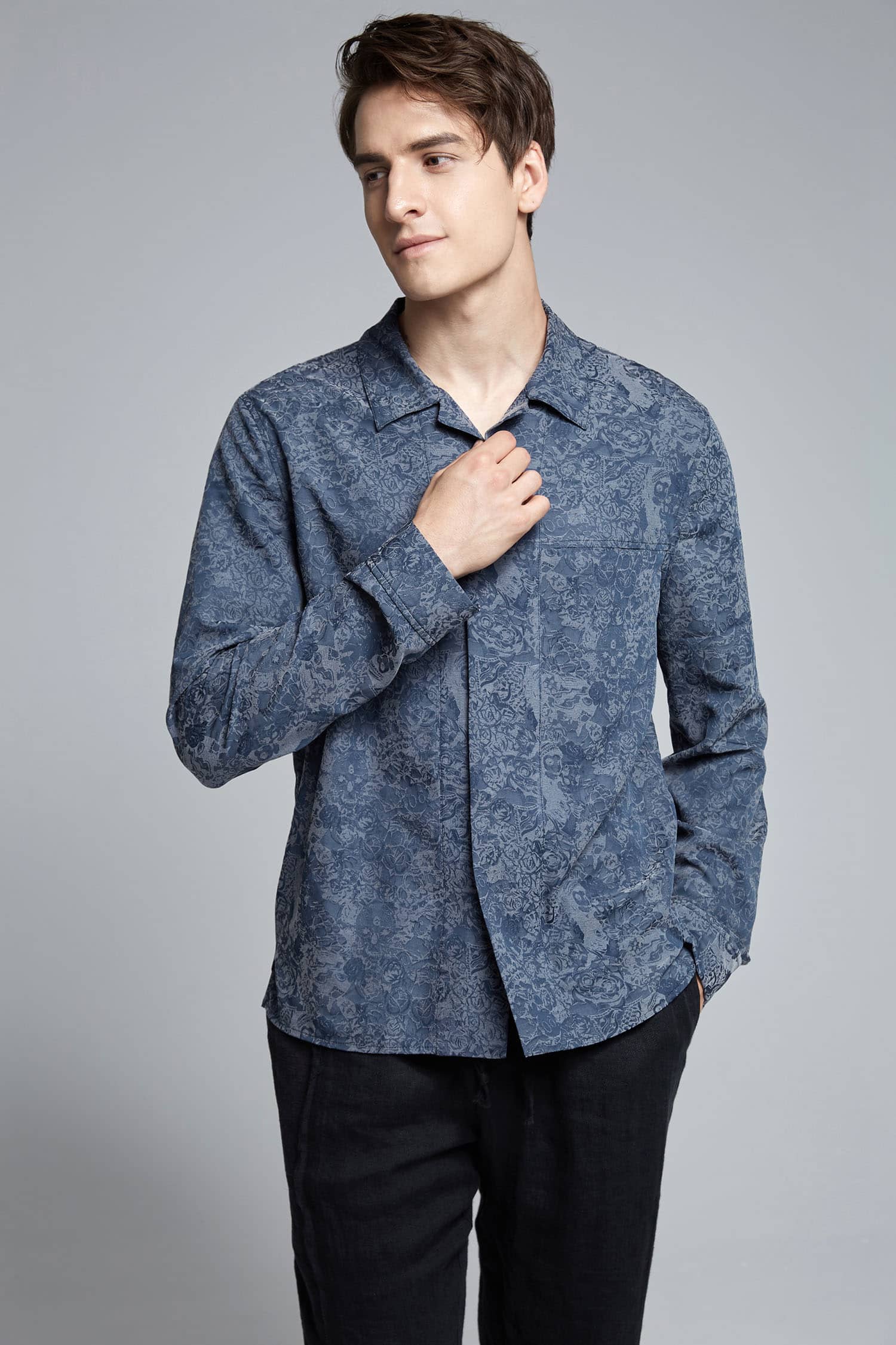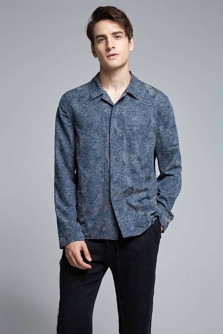 铜氨丝印花长袖衬衣,中式立领,宽暗门襟,左胸前破缝,内藏缝袋,平直下摆,微松版型,自然随性。