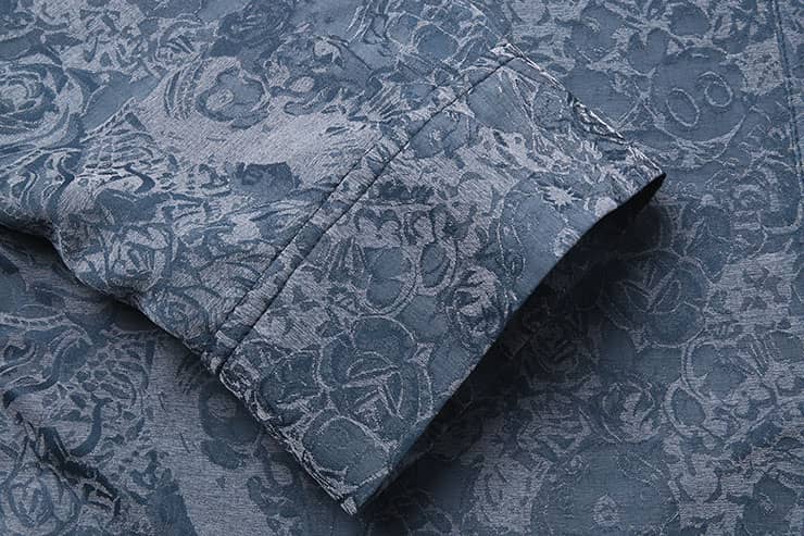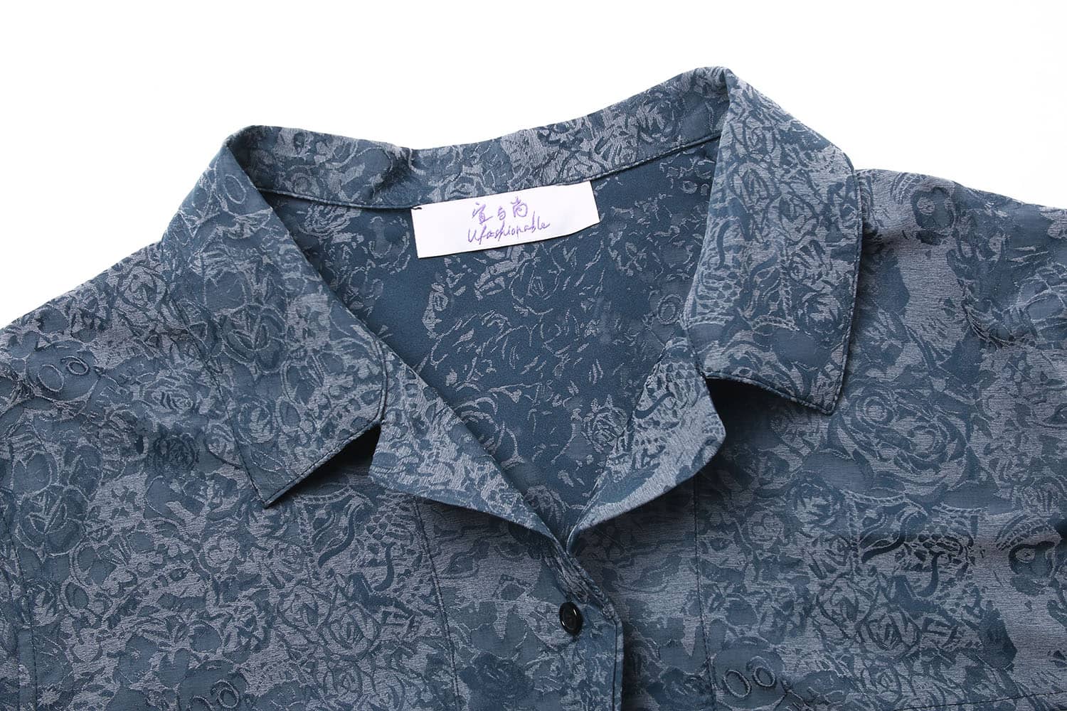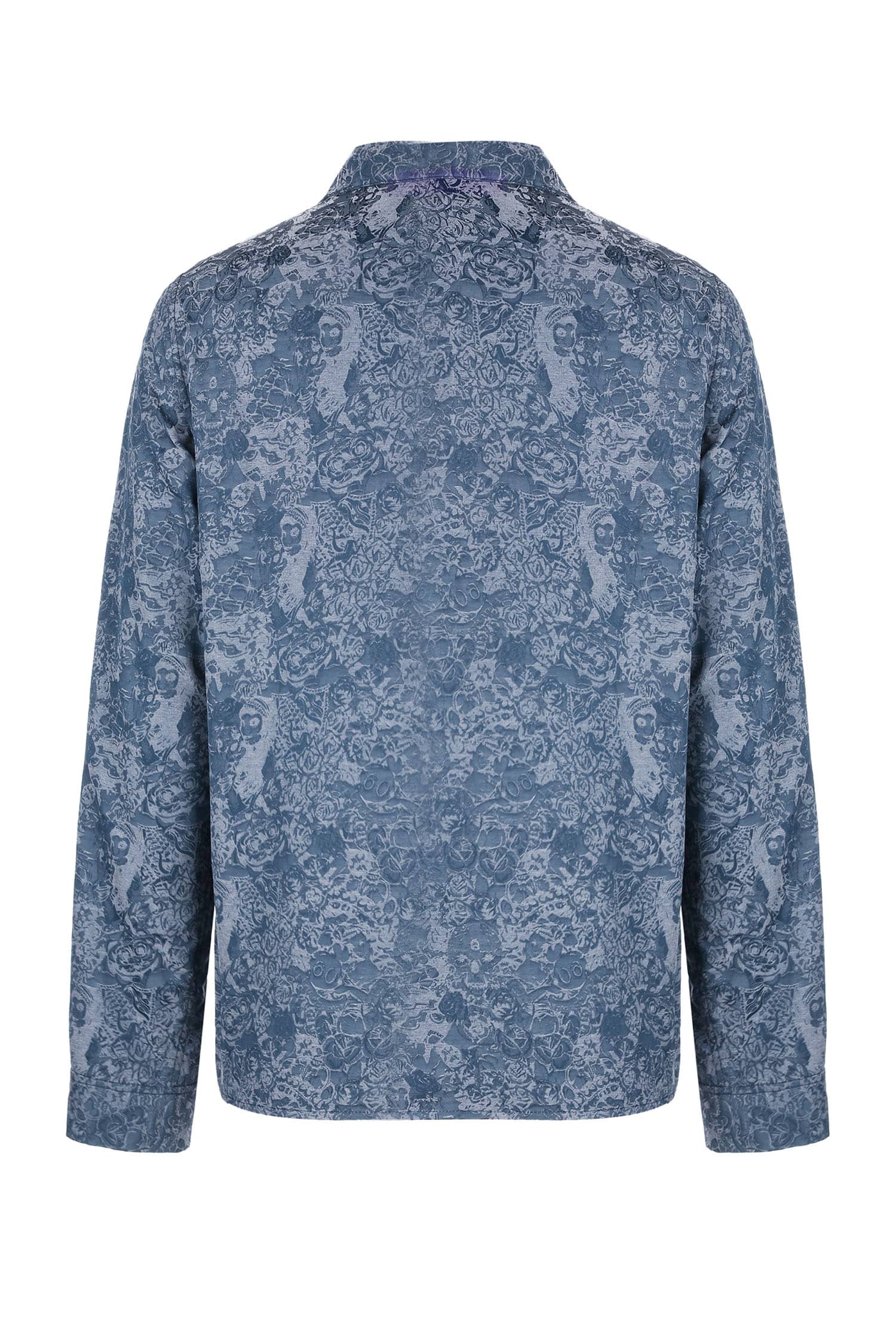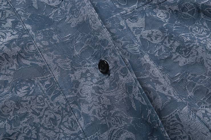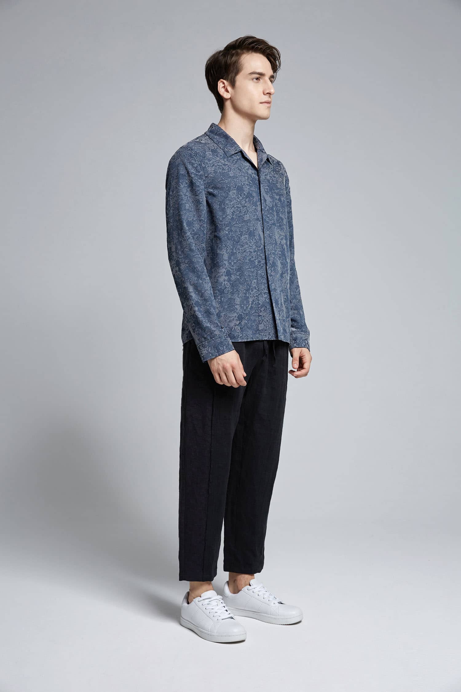 铜氨丝印花长袖衬衣,中式立领,宽暗门襟,左胸前破缝,内藏缝袋,平直下摆,微松版型,自然随性。