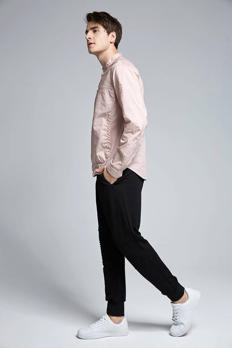 腰带松紧抽绳设计,侧边拉链口袋,裤身前中及膝盖位打条设计,后幅对称单唇袋,落裆束脚,贴合脚踝,宽松萝卜裤型,穿着轻松休闲。