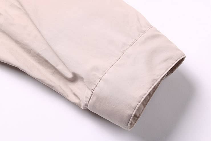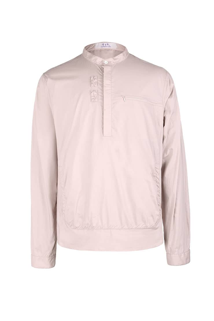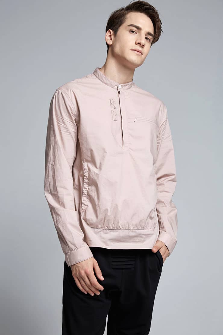 纯棉套头长袖衬衫,颜色温润低调,小立领结合半开暗襟设计,左胸前拉链口袋,右胸前打补丁装饰,下边两侧插袋,弧形下摆,简约大方,使轮廓充满设计感。