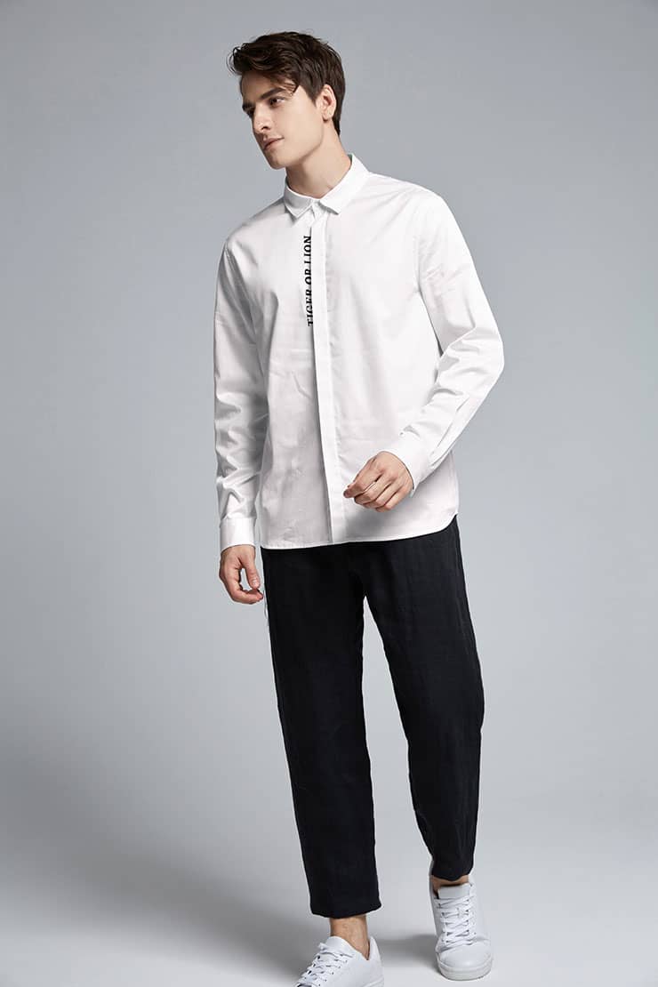 采用亚麻色织的面料,腰带松紧抽绳,前中开门襟钉纽扣,两侧斜插袋,不对称的面料拼接,拼缝毛边,后袋简约一字袋,宽松萝卜裤型,九分裤长,个性随性。
