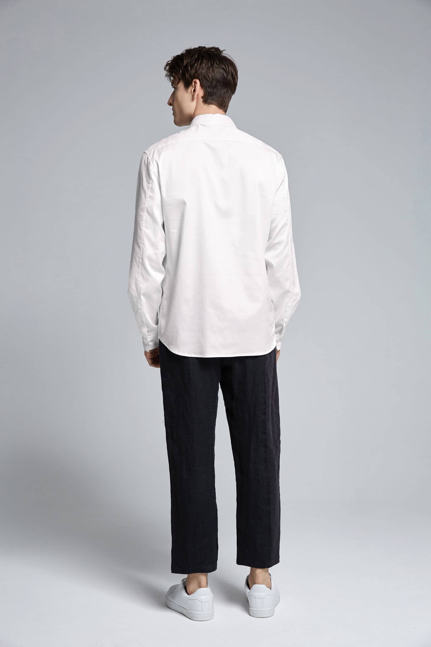 棉麻商务外套,双排六粒扣,戗驳领,三开身,下边两侧设有圆角大贴袋,袖衩四粒装饰扣,后身侧开衩,后片半里,平直下摆,呈现稳重干练的男子气质。