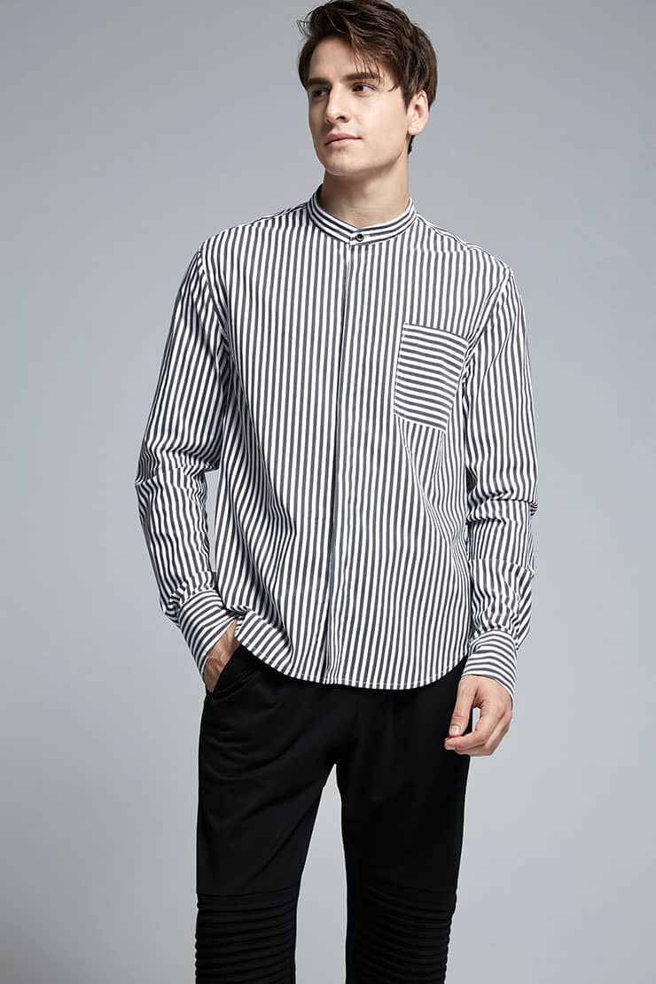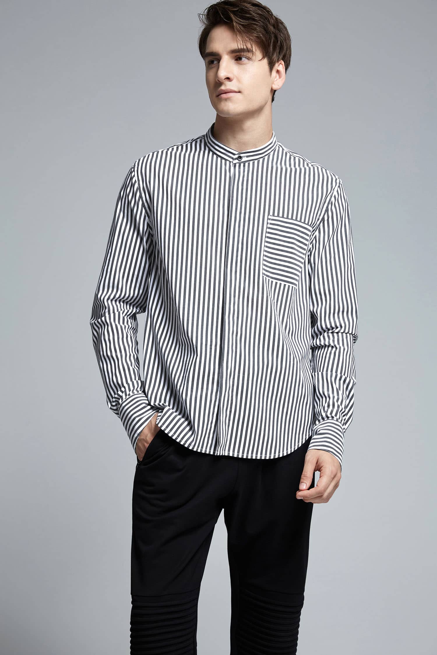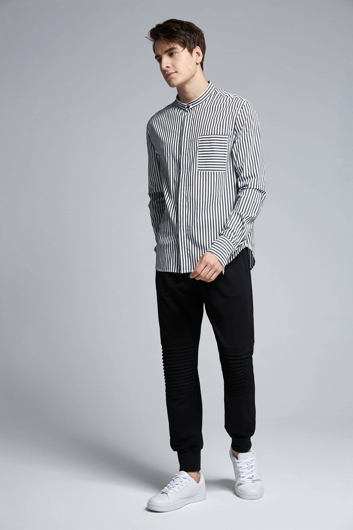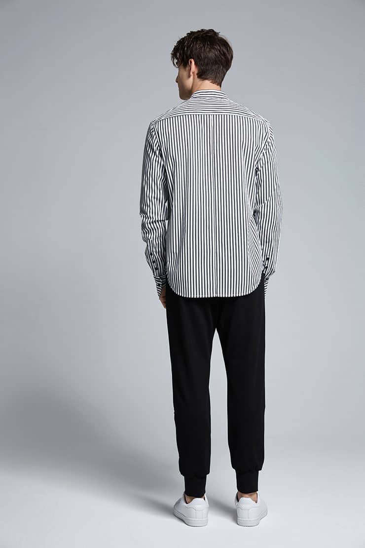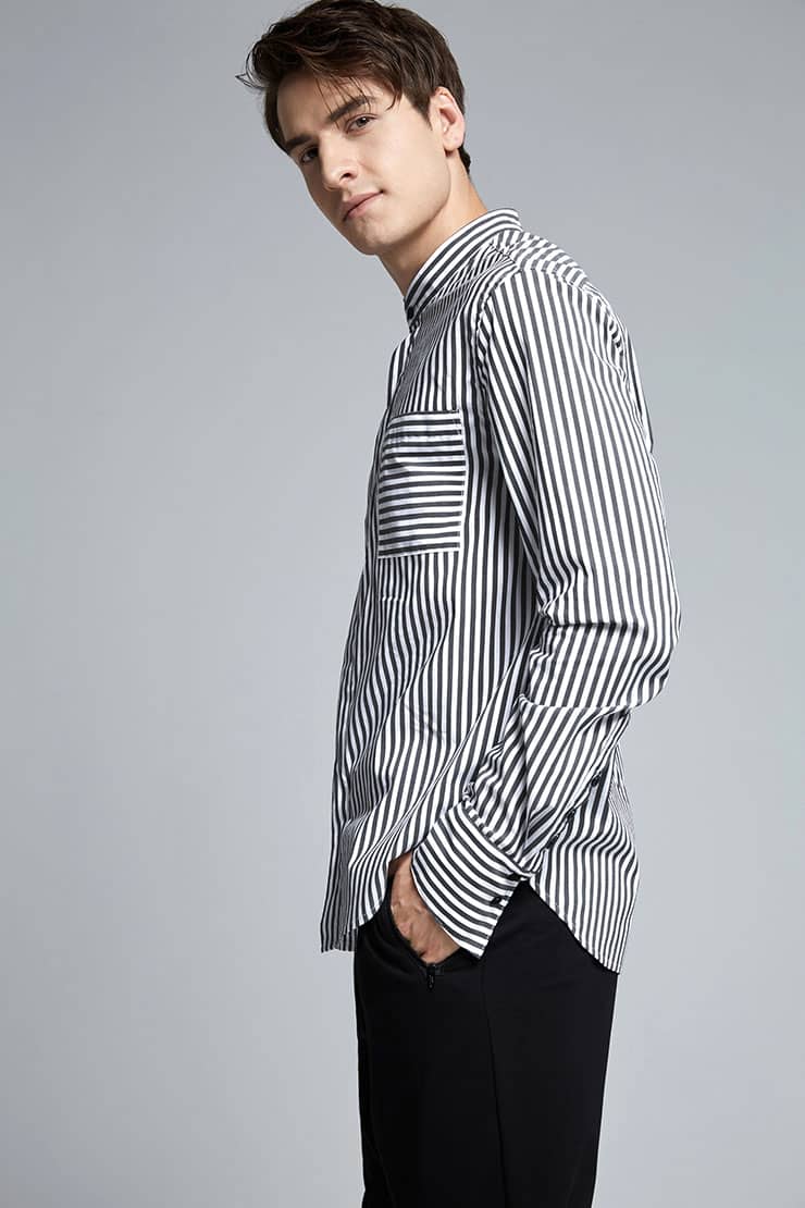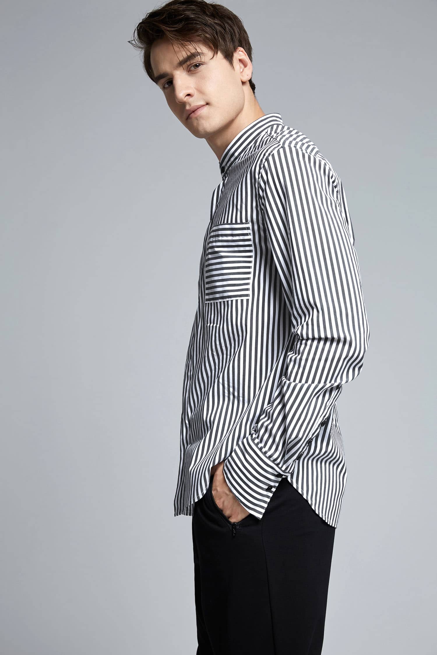 纯棉长袖衬衣,平直小立领,经典暗门襟,左前胸拼条直角贴袋,后背担干分割,后中牙签褶,弧形下摆,袖口冒尖角叠门,合体版型,打造舒适合体廓形。