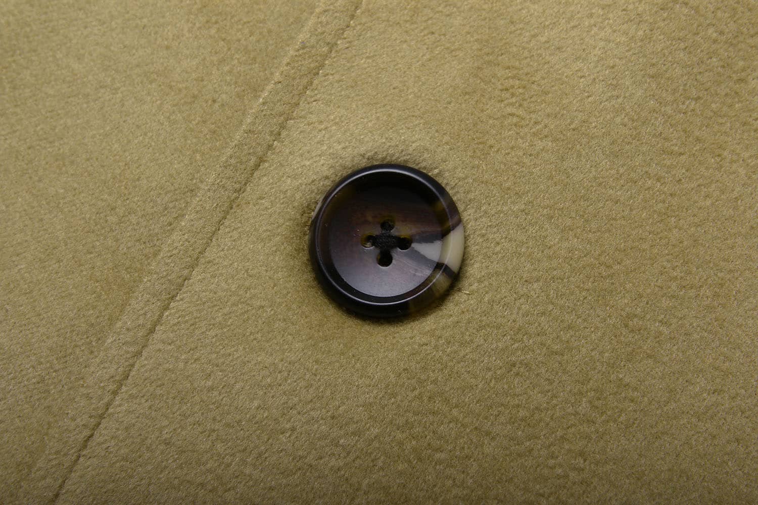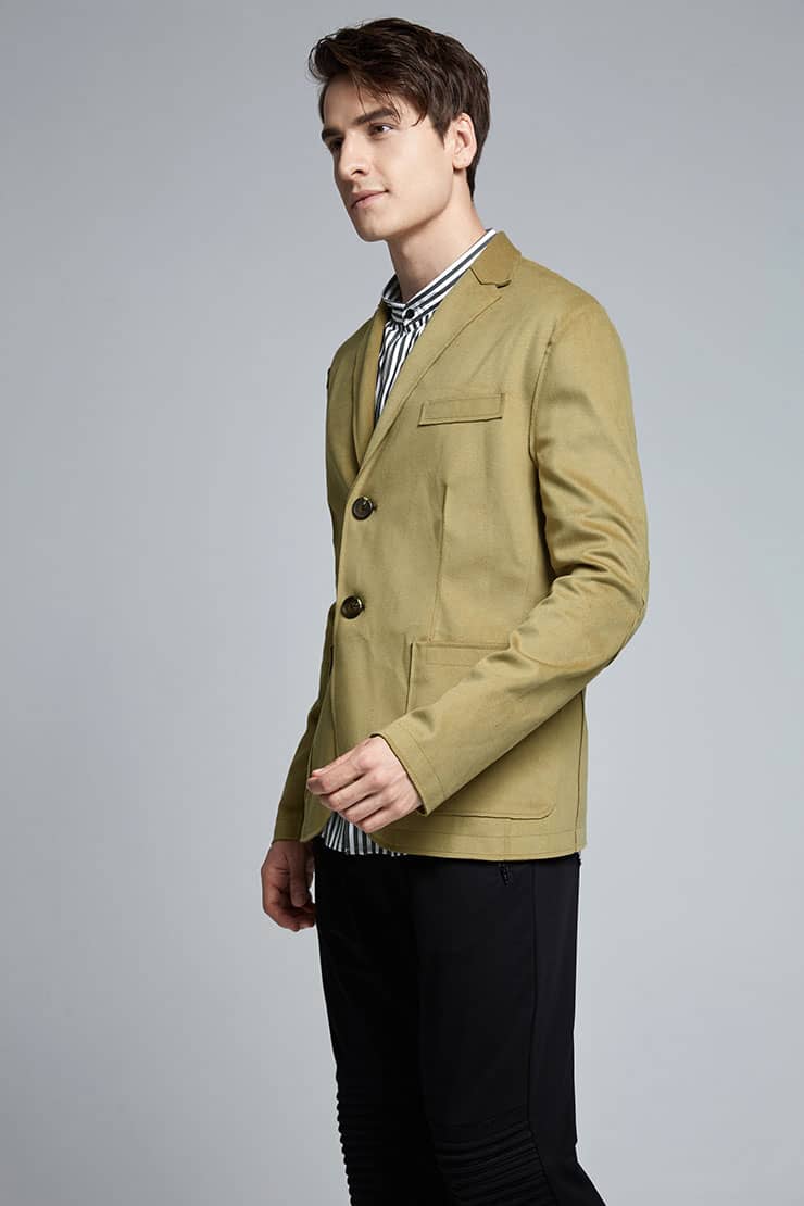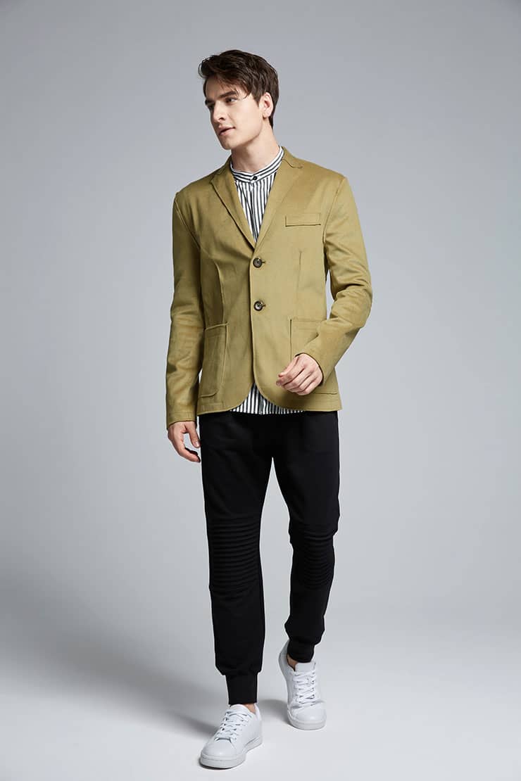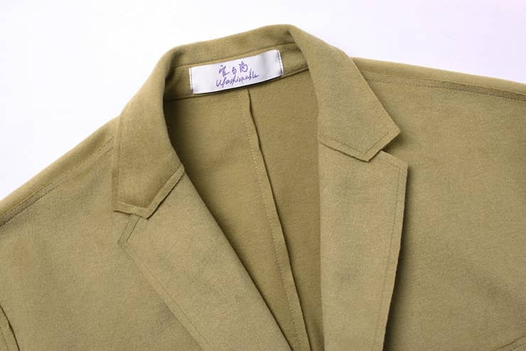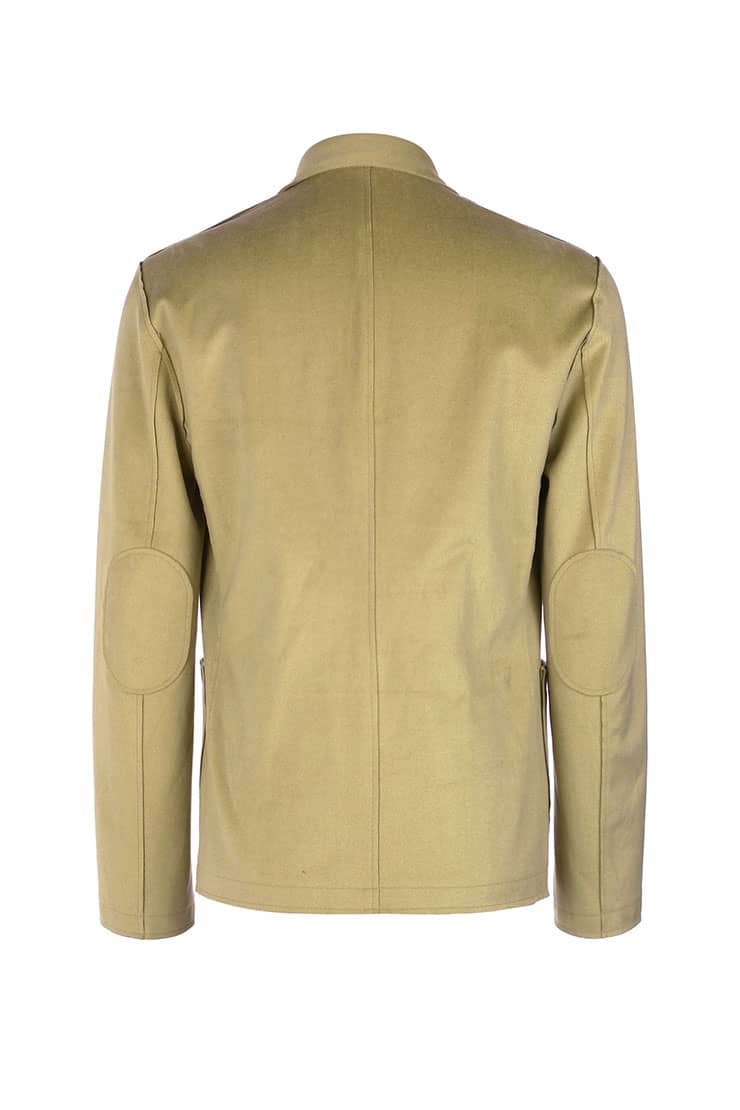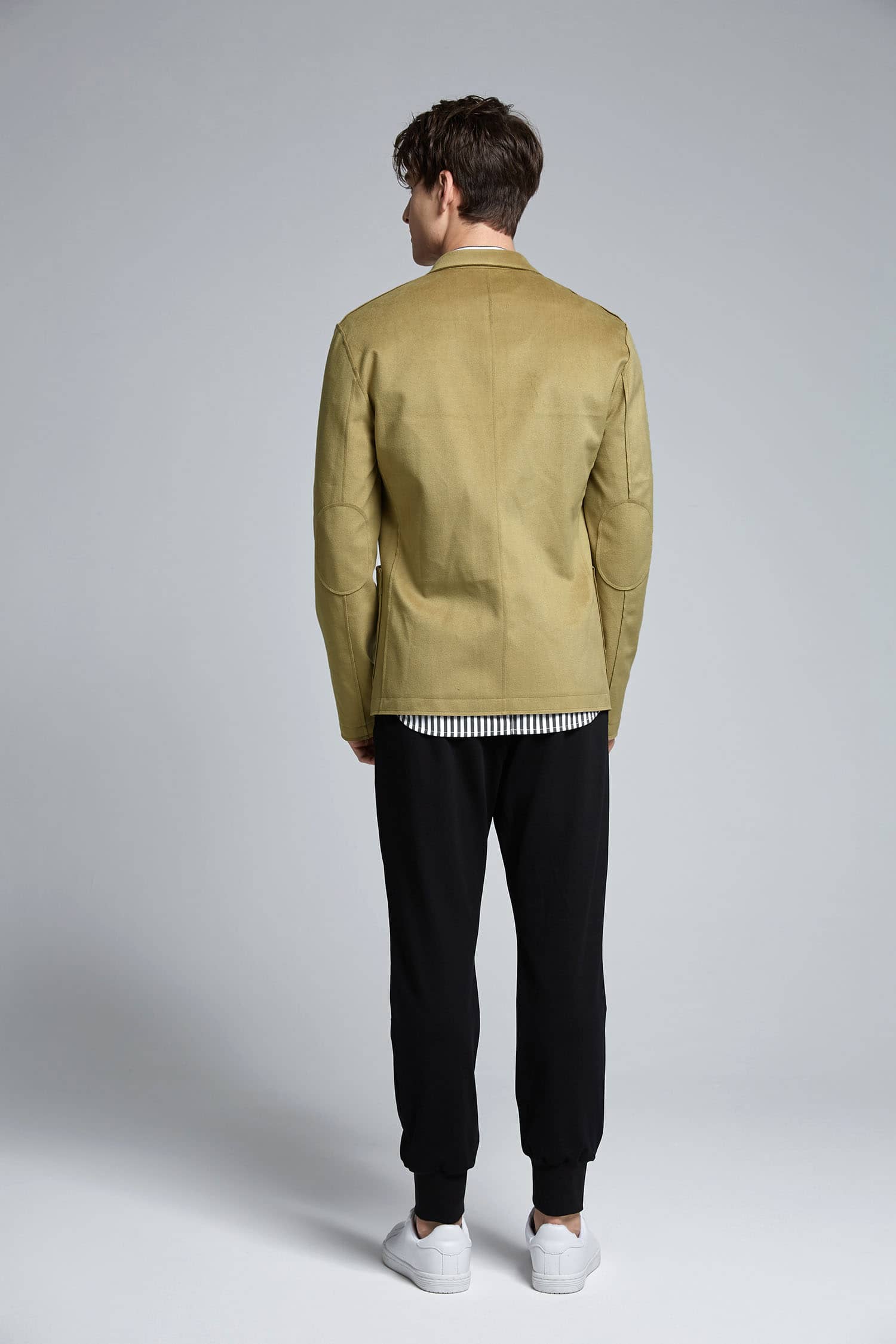 针织呢休闲西装外套,两粒扣翻驳领设计,圆摆,左胸手巾袋,下边两侧圆角大贴袋,袖肘贴补丁,整件搭缝毛边处理,赋予衣身层次感。