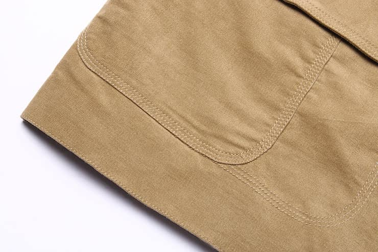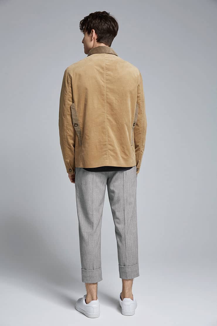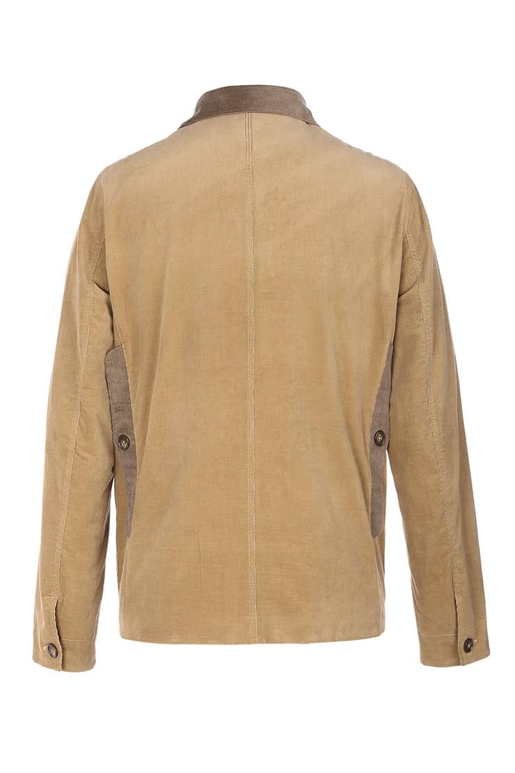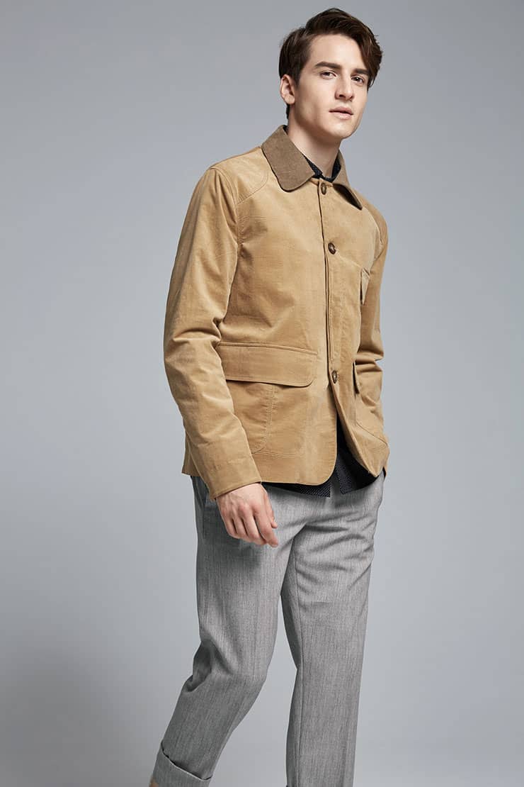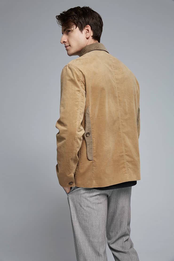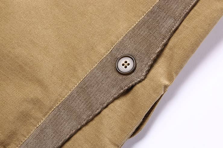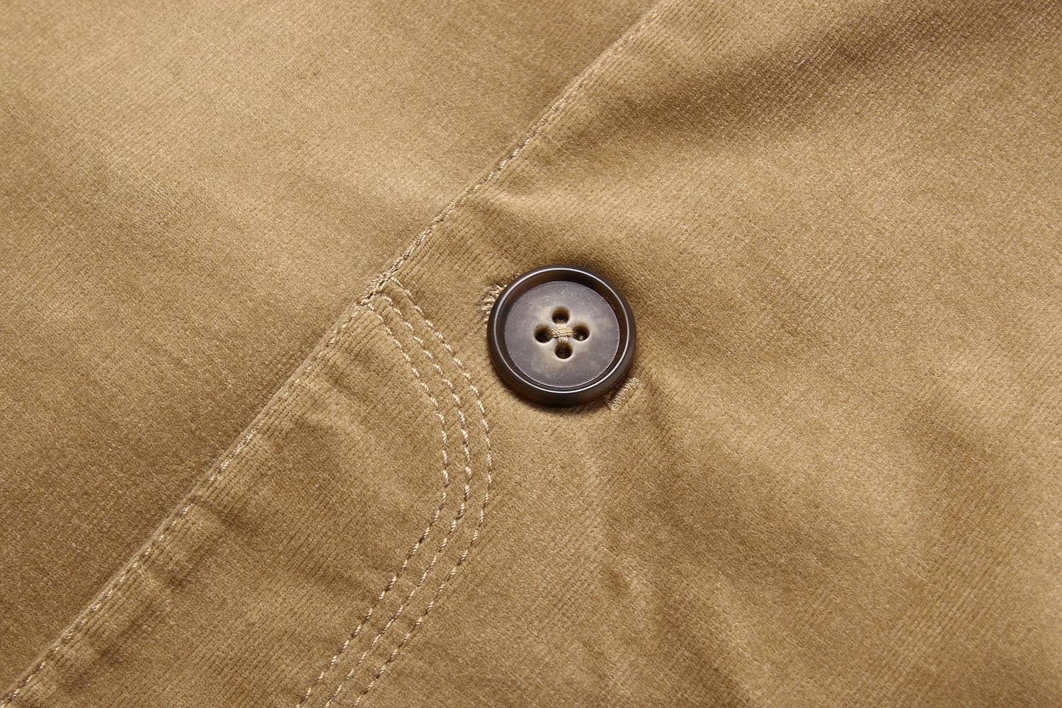 灯芯绒休闲外套,圆角撞色翻领,别致门襟设计,圆摆,前幅拼贴多个圆角口袋配袋盖,后身两侧腰袋盖装饰,整件衣身辅以三线走针,做工精细,款式时尚。