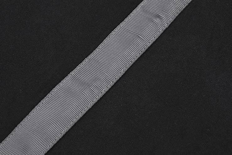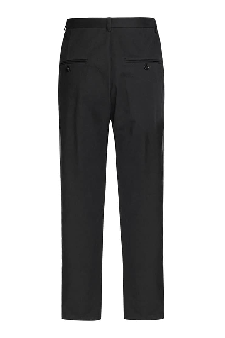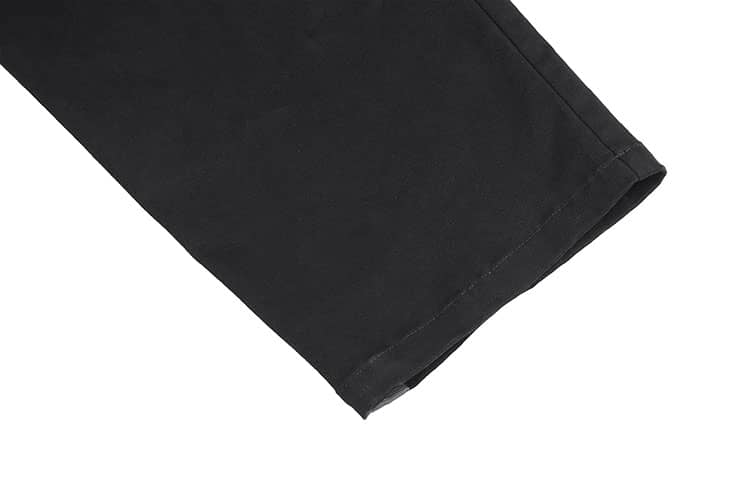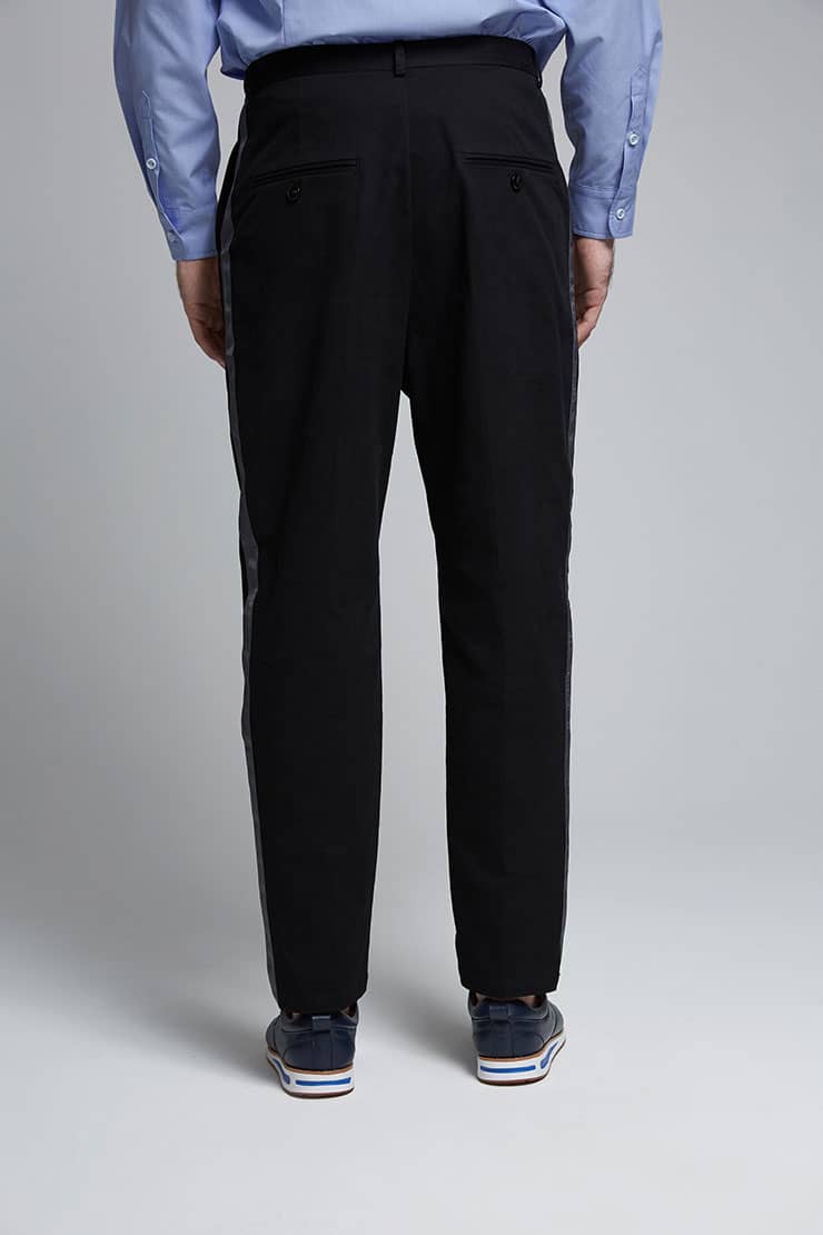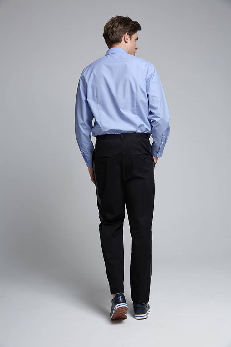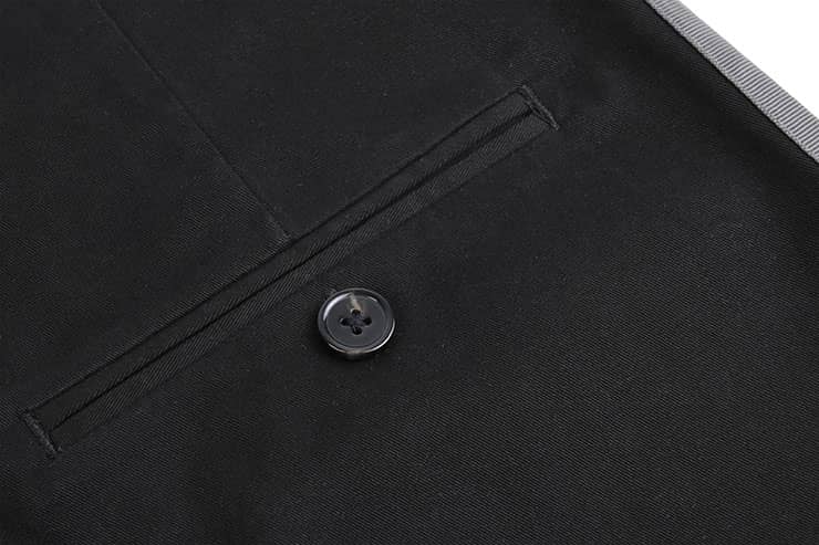 简约的裤腰,腰里用纯棉格仔面料,前中开拉链钉扣子,侧缝拼接撞色织带,后幅开线袋订扣,合体舒适的九分裤型,裤腿微松,版型随性休闲。