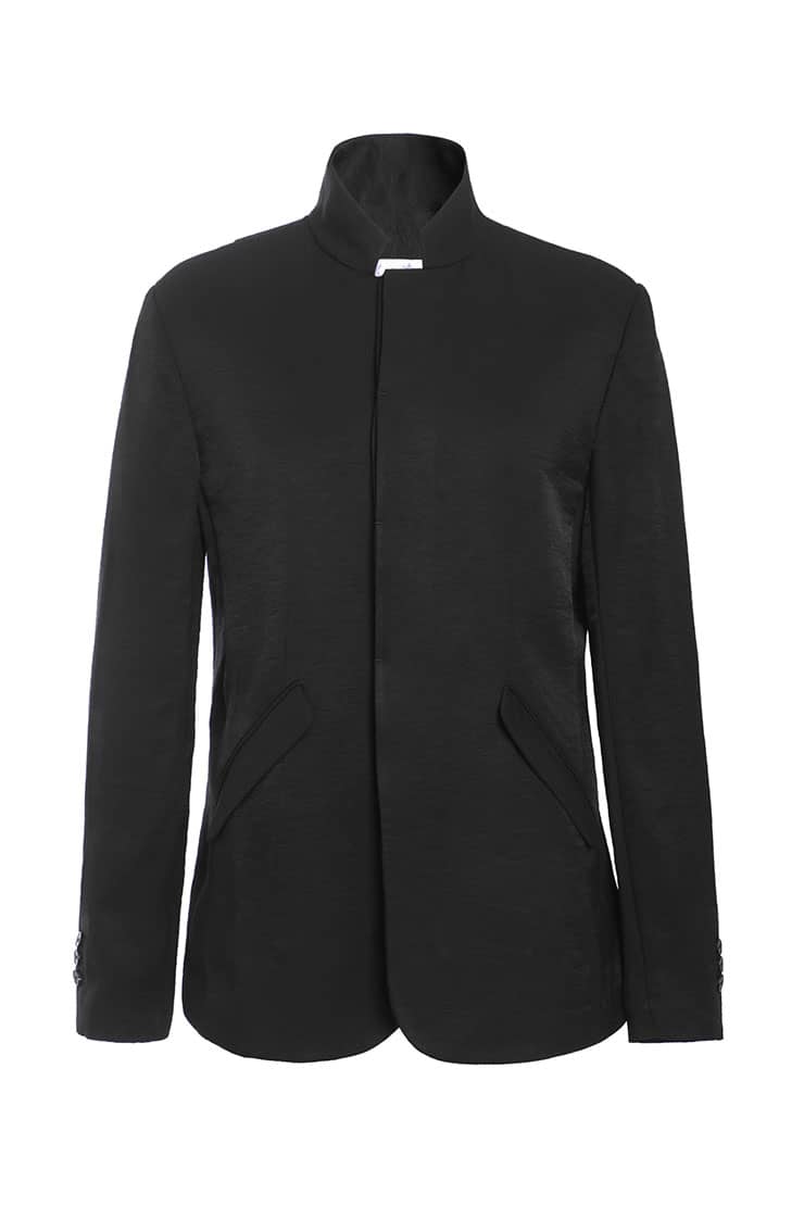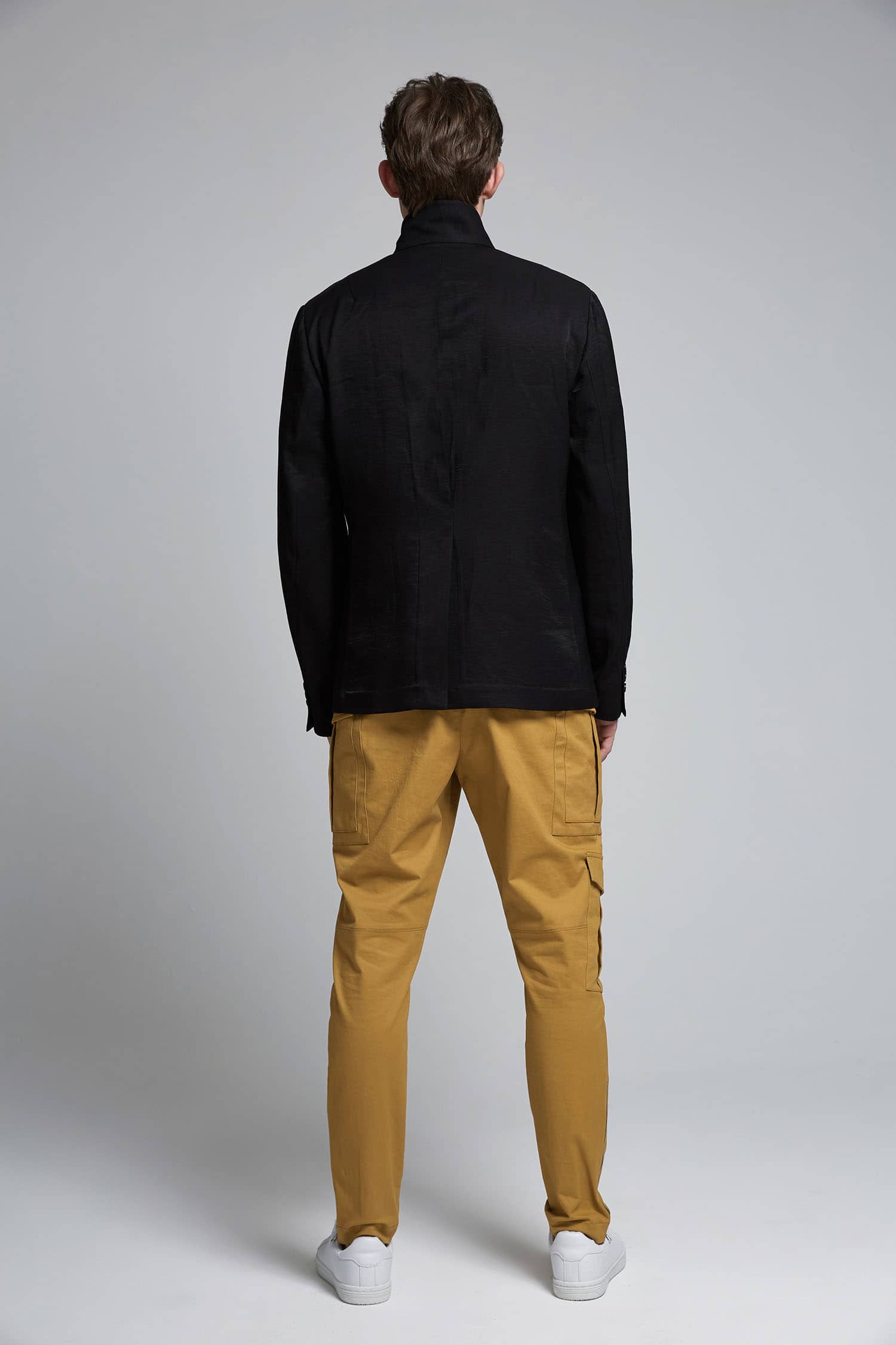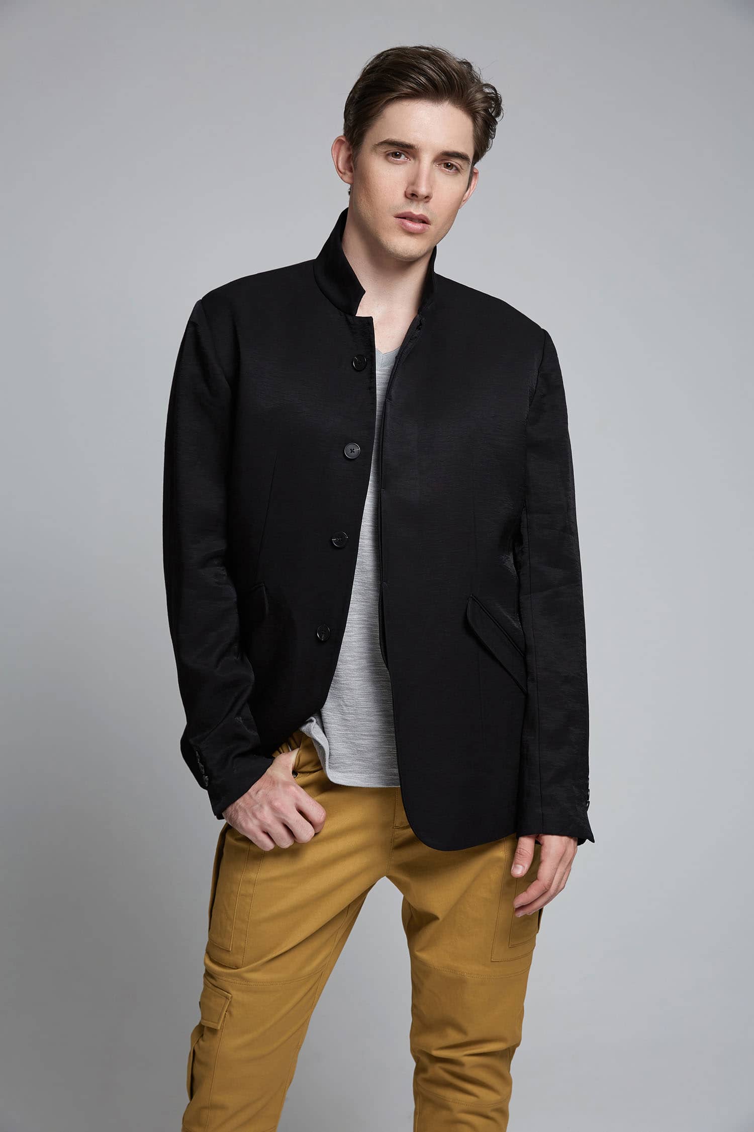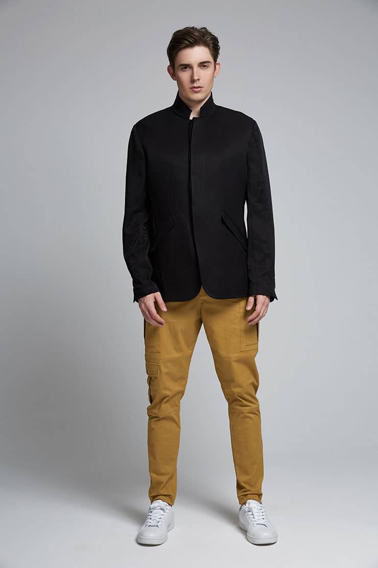 高密支的梭织面料,防风、挺括舒适,立领,暗门襟,圆角下摆,前幅下边两侧设有斜插夹袋盖的双嵌线衣袋,袖子倾斜分割,袖叉设有三粒扣。