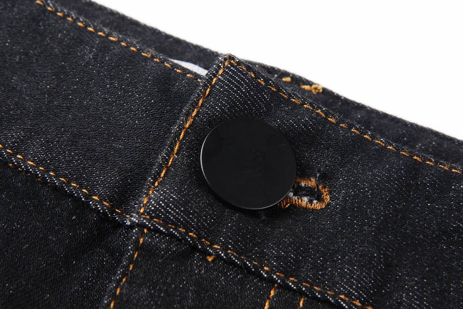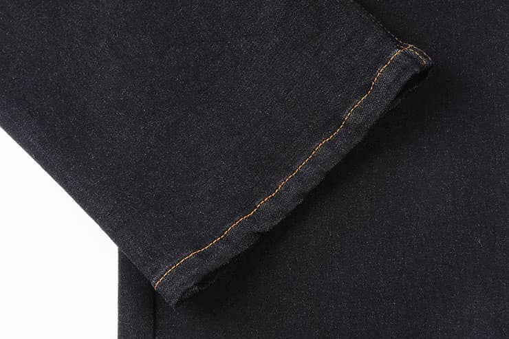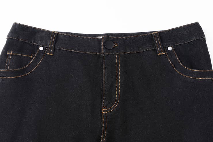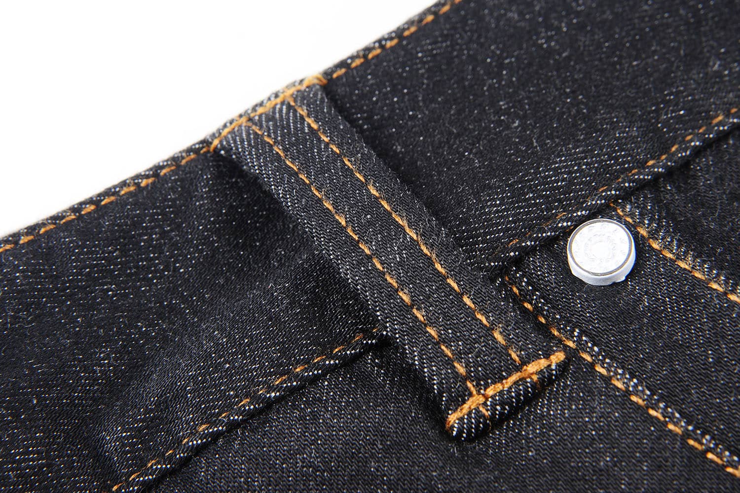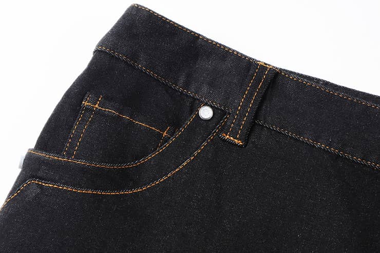 月牙口袋,袋口两端用装饰柳钉套死,金属拉链,开合顺畅;后腰金色复古贴牌,时尚别致;整件采用古铜双线缝纫,工艺结实美观。
