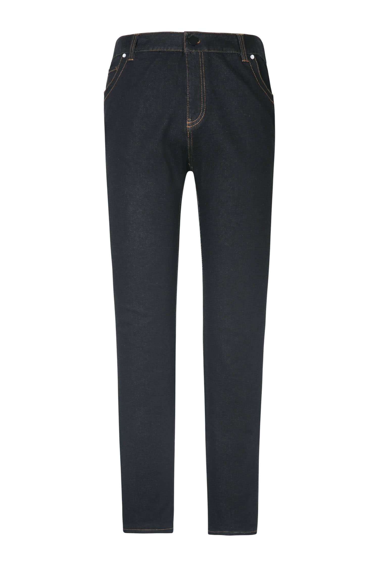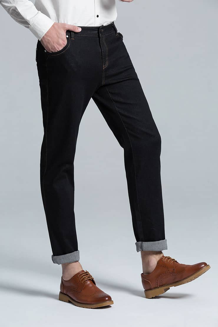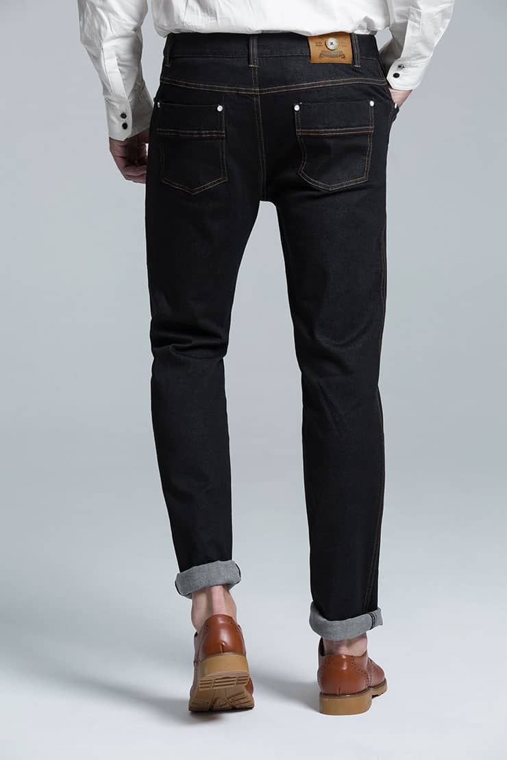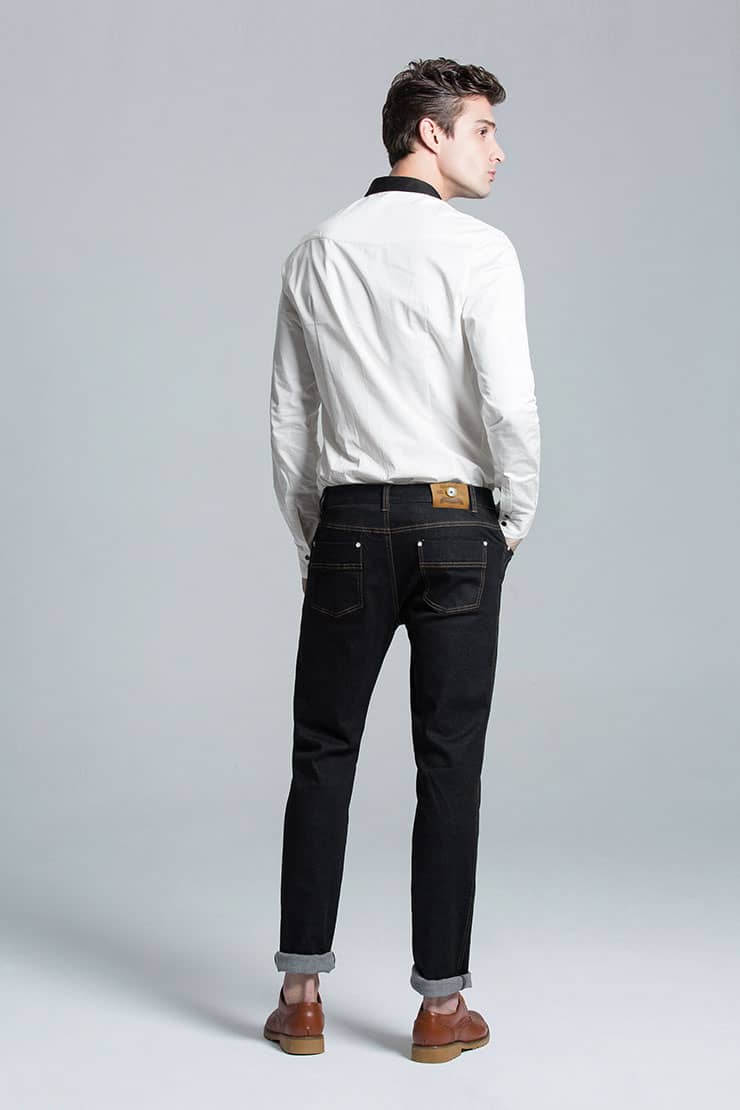 月牙口袋,袋口两端用装饰柳钉套死,金属拉链,开合顺畅;后腰金色复古贴牌,时尚别致;整件采用古铜双线缝纫,工艺结实美观。