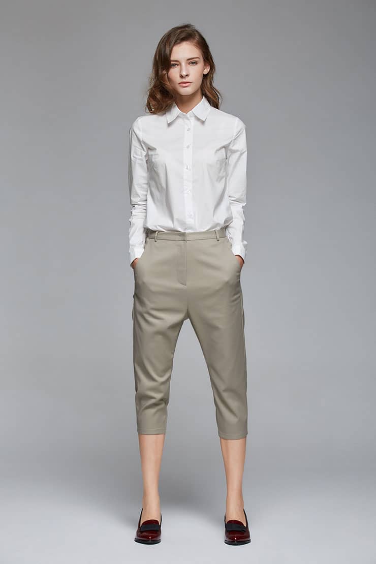 连腰褶裥高腰,腰间撞色鸡眼与腰带,时尚别致;前片立体单褶裥,侧缝插袋,前中隐藏五金拉链门襟,背后单个翻盖后右袋;八分裤长,合体锥形哈伦裤廓形;面料垂顺,耐磨抗皱