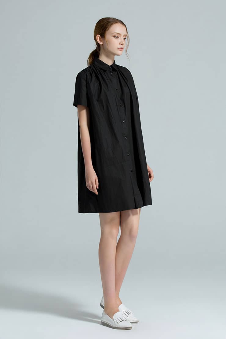 衬衫式翻领,袖口折边短袖,前襟多粒金属四合扣,立体工装大贴袋;腰部拼接分割收腰,过膝下摆,直筒修身廓形,性感霸气;梭织斜纹面料,加入少许氨纶使其富有弹性,舒适耐穿
