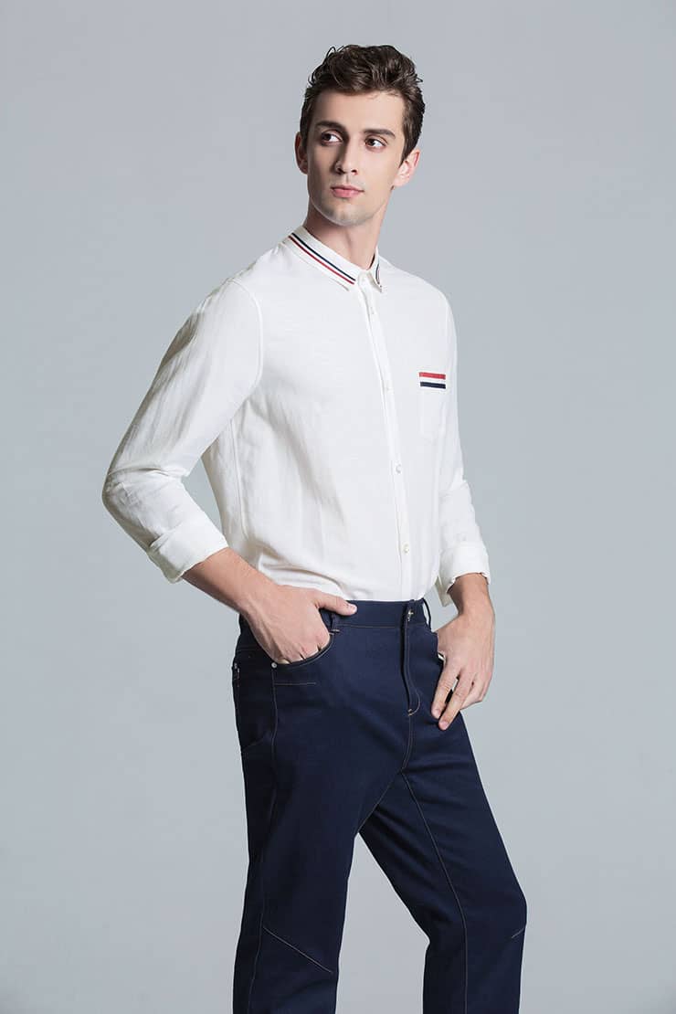 双翼小立领剪裁,前胸立体式牙签褶设计,简洁的版型轮廓,衣身采用高精密度的棉纤维衬衫面料,具有很好的吸湿性和透气性,穿着舒适。